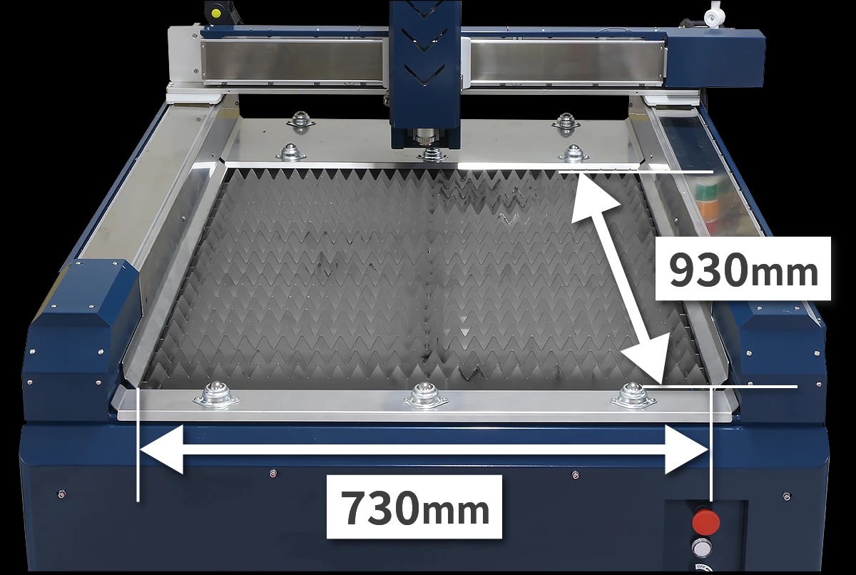ファイバーレーザー切断機は大型で場所をとる」幅730mm×奥行930mmを確保。さらに奥行き方向には遮るものがないため、長尺の素材もセット可能です。限られたスペースでも本格的な金属切断ラインを構築できます。